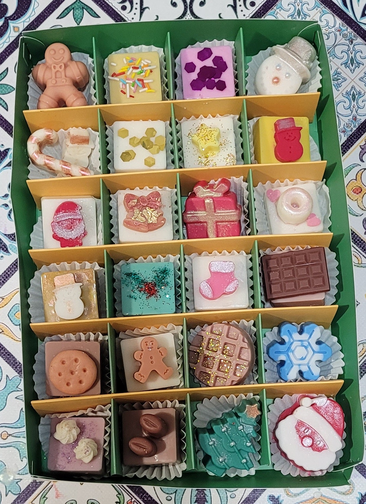 Calendario de adviento con unos 300 gramos aproximadamente de waxmelts. Con aromas exclusivos para este formato que recuerdan a la navidad (galletas de jengibre, pudding de navidad, roscón de reyes, panettone...).