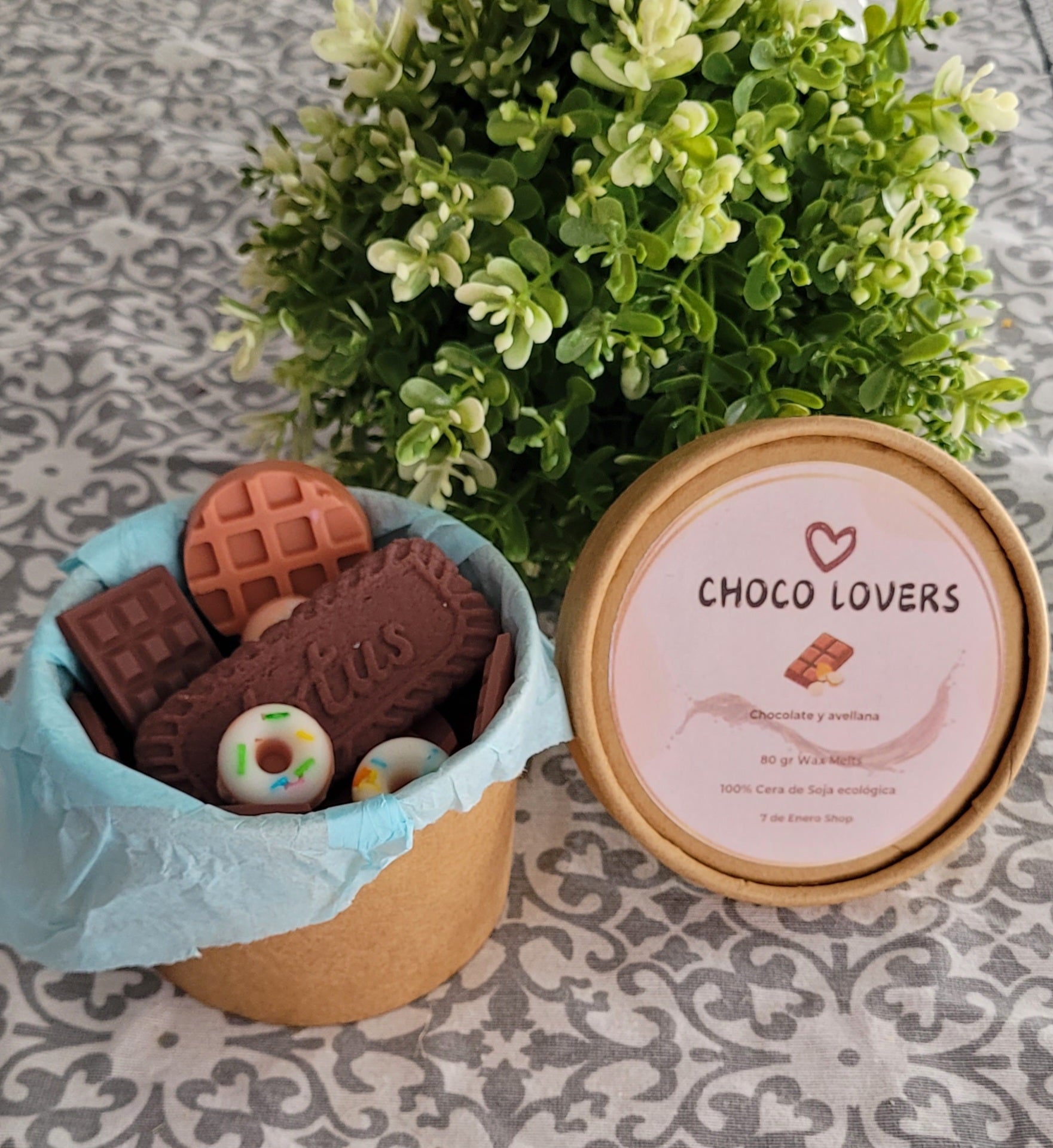 Caja de 80 gramos de cera de soja con aroma a chocolate y avellana.