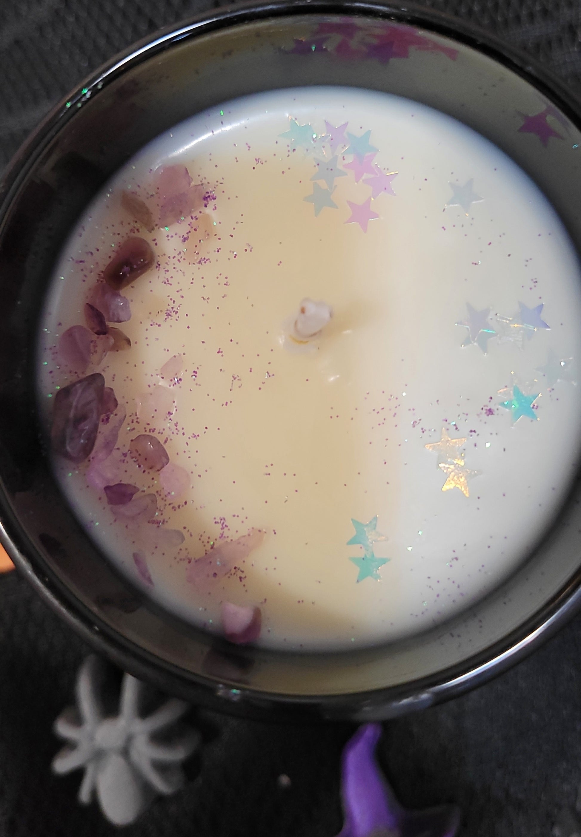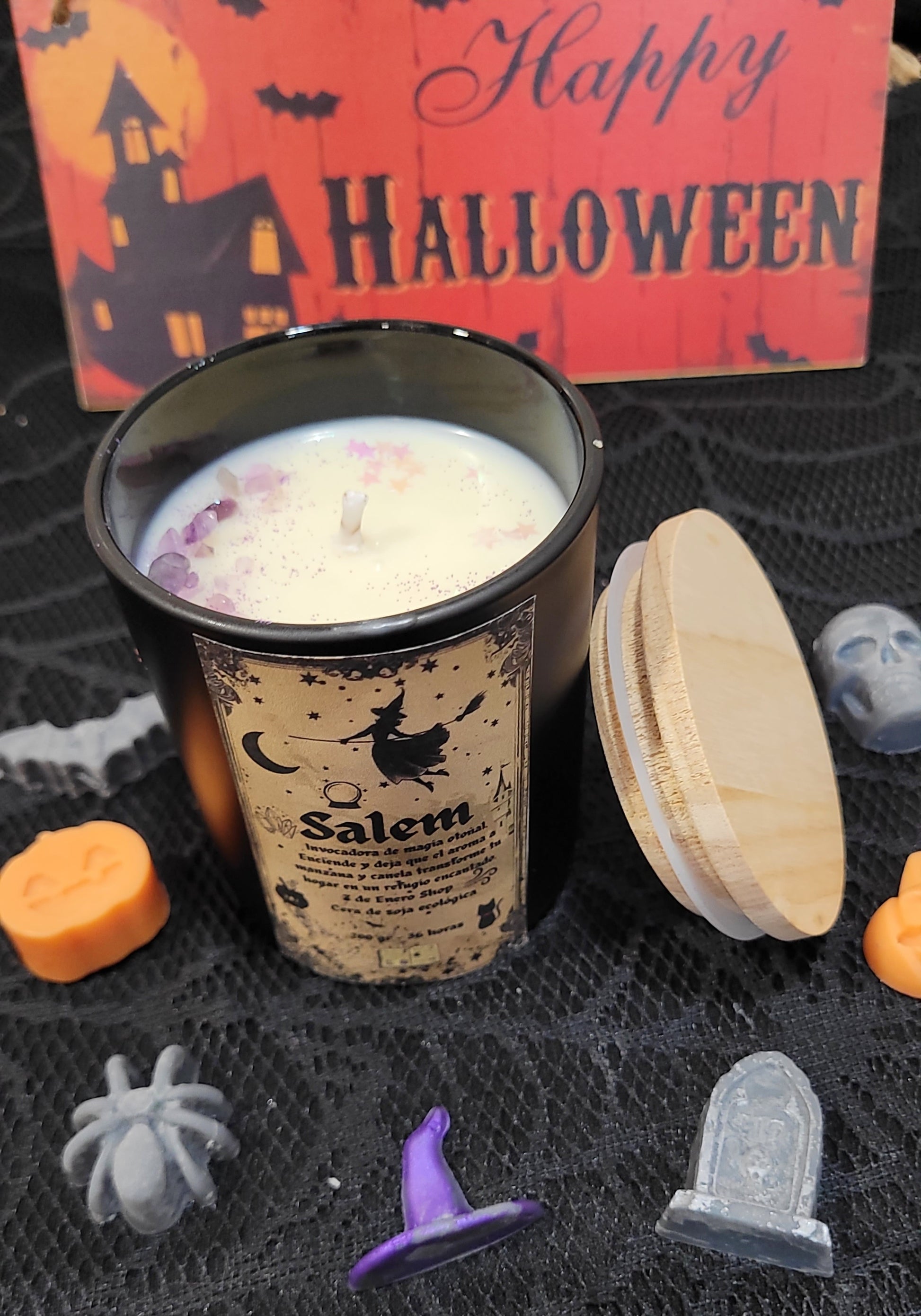 Nuestra vela Salem, coronada con piedras de amatista (protección y calma), te transporta directo a un aquelarre de aromas. 🕷️✨